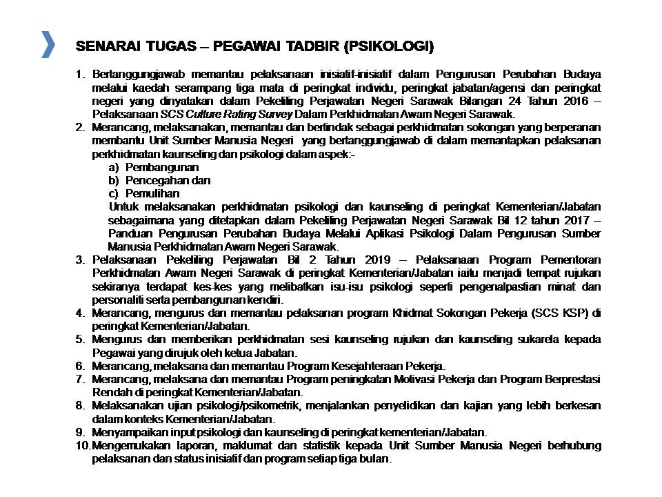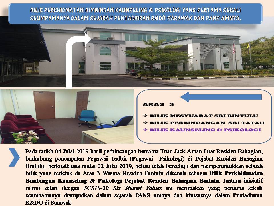Jawatan Pegawai Tadbir Psikologi di dalam Perkhidmatan Awam Negeri Sarawak (PANS) mula dikuatkuasa melalui satu pertemuan khas di antara YBhg. Datu Dr Sabariah Putit Timbalan Setiausaha Kerajaan Negeri Sarawak (Prestasi dan Transformasi Penyampaian Perkhidmatan, PANS) bersama-sama dengan para Ketua Jabatan yang berkenaan pada tarikh 02 Julai 2019 di Tingkat 2 Wisma Bapa Malaysia.